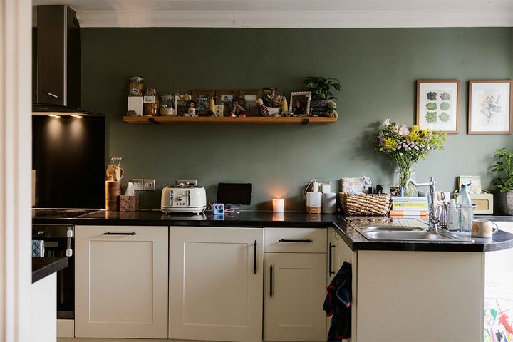 壁の色にはダイニングスペースのライトブラウンと相性のいいグリーンを選択。「キッチンは庭にもつながっているので、グリーンで外につながるイメージにしました」