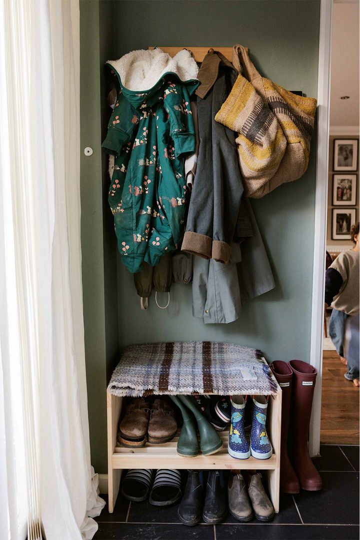 アウトドア好きな子どもたちと一緒にすぐ庭に出られるように、キッチンにある裏戸にも下駄箱を設置。よく雨の降るイギリスらしく、長靴やウォータープルーフの羽織りものが用意されている。