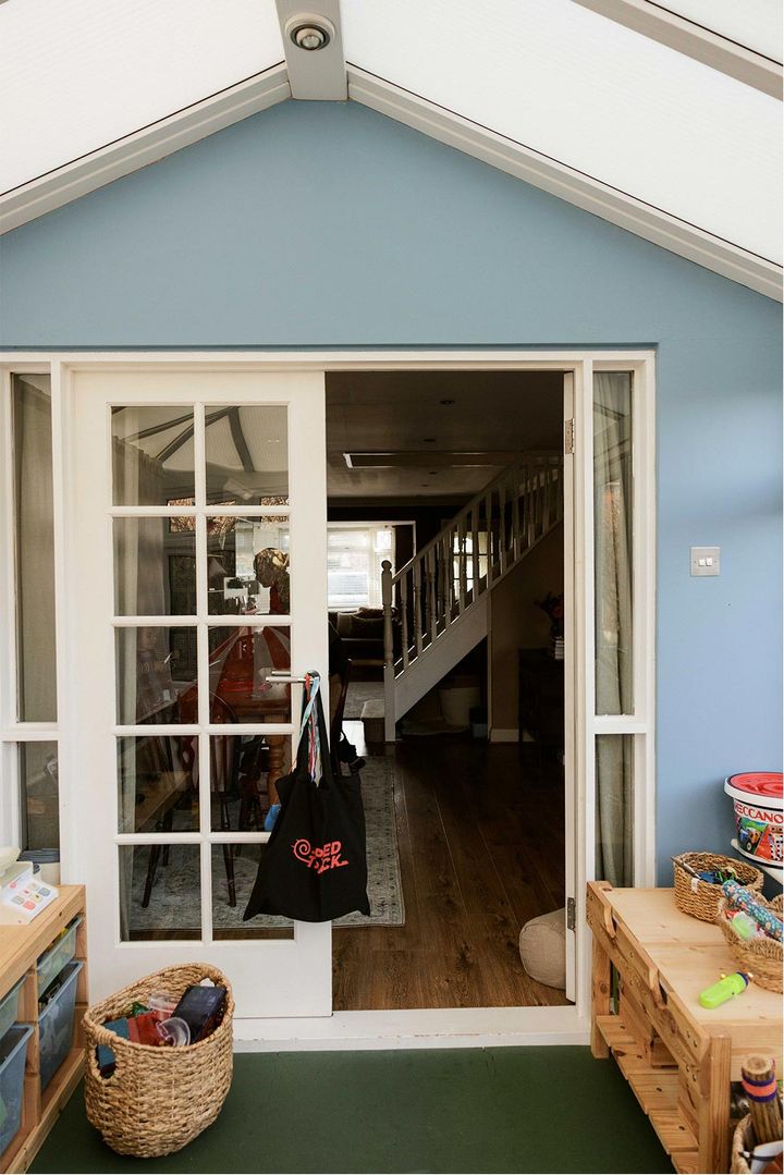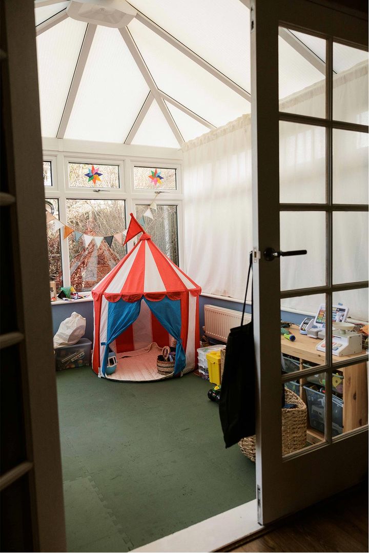 イギリスの家屋でよく見かけるコンサバトリーは、ガラス張りの屋根や大きな窓からたっぷりと自然光が差し込むつくりが特徴。こちらのお家では、庭を連想させるグリーンのフォームマットを敷いて子どもたちのプレイルームとして活用している。