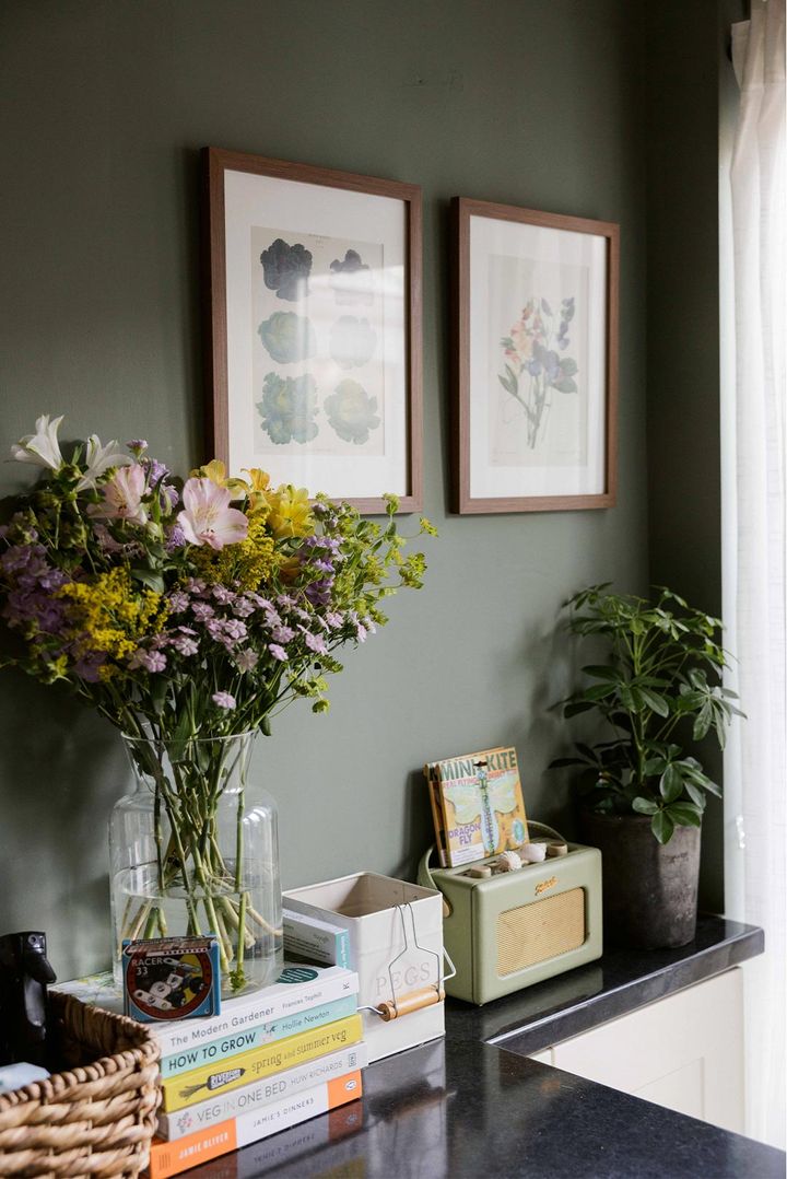 花瓶には季節の花、額にはイギリスのガーデニング組織である〈RHS〉のイラストと、自然派のローラさんの嗜好が表現されたコーナー。レトロなラジオもポイント。