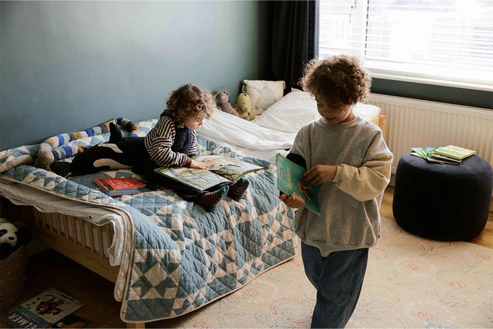 「活発な長男の部屋はプレイフルなデザイン。おとなしい次男のタナーは最近ひとりで寝る練習をし始めたところなので、温もりと安心感のあるハウスベッドを設置しました」。子どもたちの性格や成長に合わせてインテリアも変化を遂げていくキッズルーム。