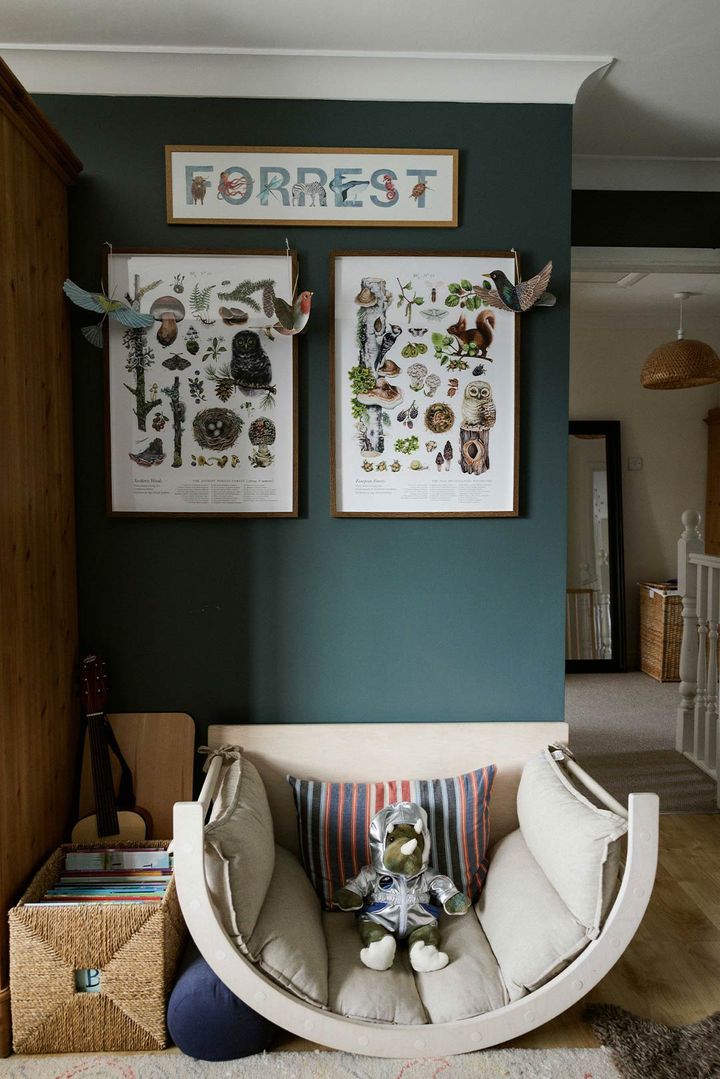フォレストくんのお部屋は、緑がかったブルーがテーマ。〈FitWood〉のクライミングアーチチェアは、ロックチェアとしても反対向きにしてクライミングアーチとしても使える、多用途性のある北欧デザインが大活躍。