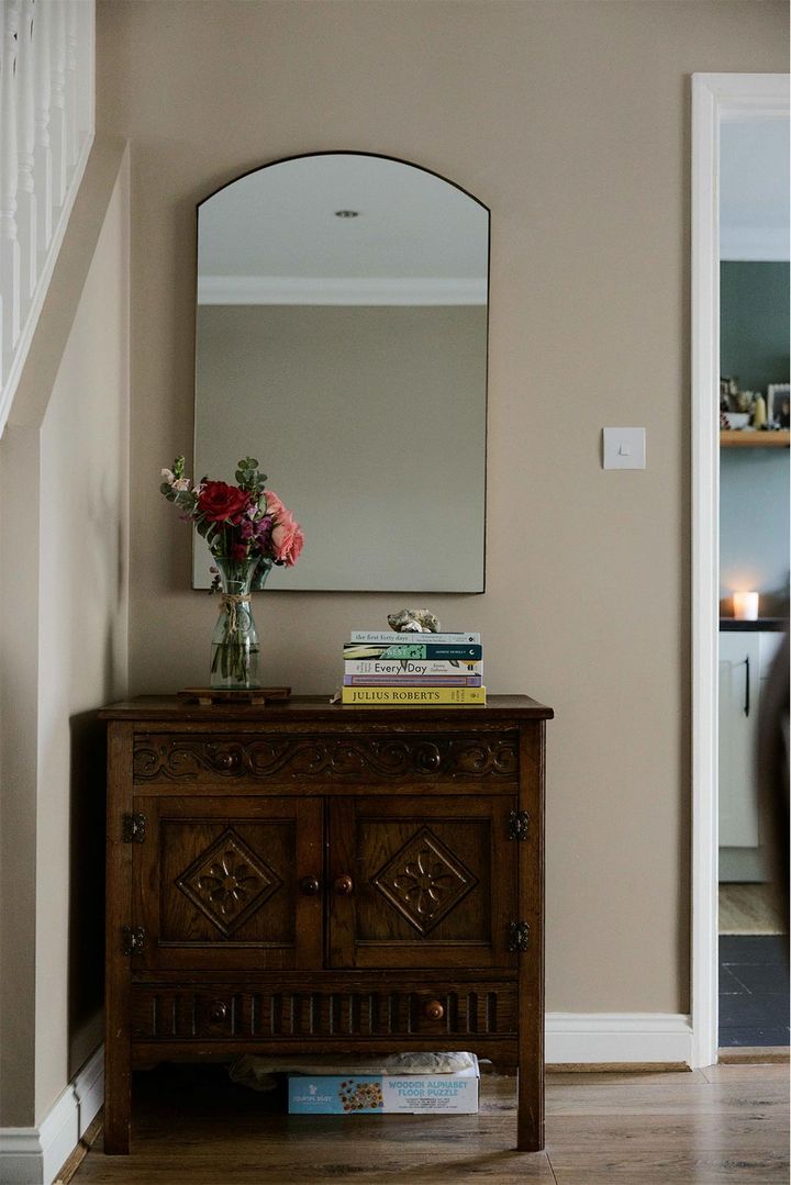 アンティーク感が気に入り、中古サイトにて15ポンドで購入したキャビネット。ミラーを合わせて設置することで、抜け感が生まれて重く感じさせない。