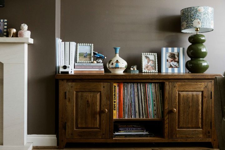 ジョーさんの大切なレコードコレクションを保管しているサイドボードは、不用になった中古家具をお得に買えるオンラインサイトでゲット。〈William Morris〉のテキスタイルを使用したランプはイギリスのインテリアショップ〈Homesense〉で購入したもの。