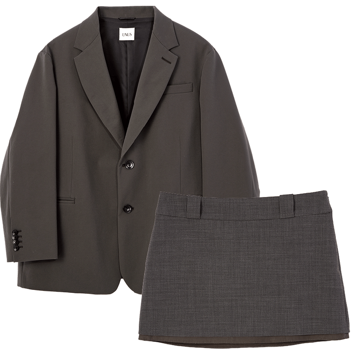 上から:オーバーサイズでハンサムな1着。ジャケット¥77,000、薄手の素材が裾から覗くレイヤード仕様。ミニスカート¥38,500(共にユナス/エストネーション)