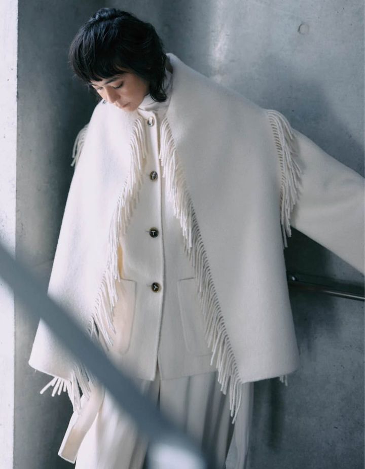 フリンジがポイントになったケープ付きコートを主役に、ワントーンでまとめてクリーンに。落ち感のある素材のパンツを合わせ、軽やかさはキープ。ありそうでない、コンテンポラリーなデザインが目を引く。コート¥229,350、パンツ¥83,050(共にトーテム/トーテム クライアントサービス)