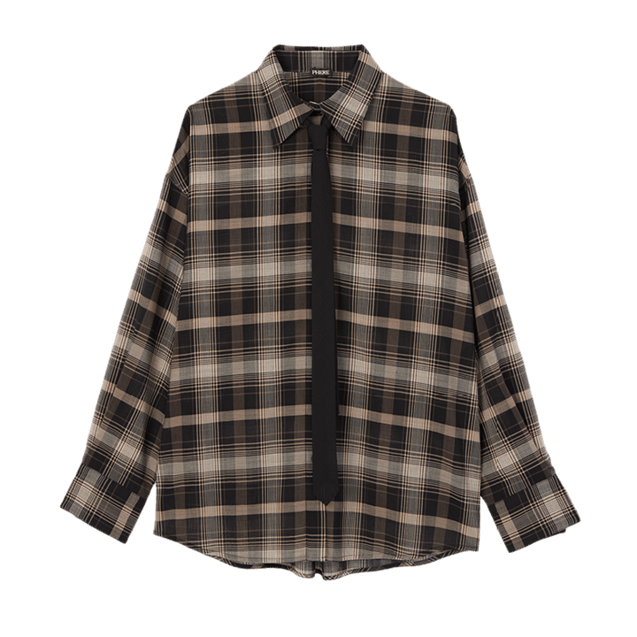 さり気なく透け感のある素材を使用。ボウタイ付きチェックシャツ¥27,000(PHERE)