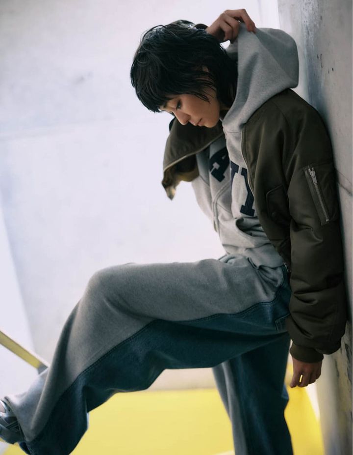 MA-1にロゴ入りのフーディ、デニムパンツと王道のアメカジコーデながら、こだわり抜かれたシルエットや素材使いで、こんなにも遊び心溢れる着こなしに。ショートブルゾン¥97,900、フーディ¥42,900、スエットデニムパンツ¥53,900(全てアンスクリア/アマン)、スニーカー¥22,000(アシックス/アシックスジャパン カスタマーサポート部)