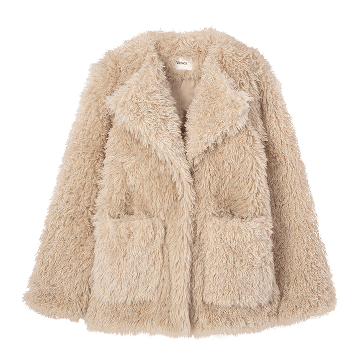 今季らしいフェイクファーコートは、長い毛足とボリュームに反して、軽やかな着心地が特徴。優しいエクリュカラーは着まわし力も抜群。ファーコート¥55,000(ヴェニカ/Souple)