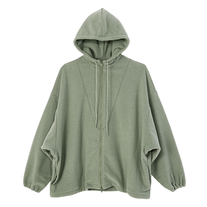 オーバーサイズのフーディは旬のフリース素材。ジップアップフーディ¥33,000(オニット/フェアズフェア)