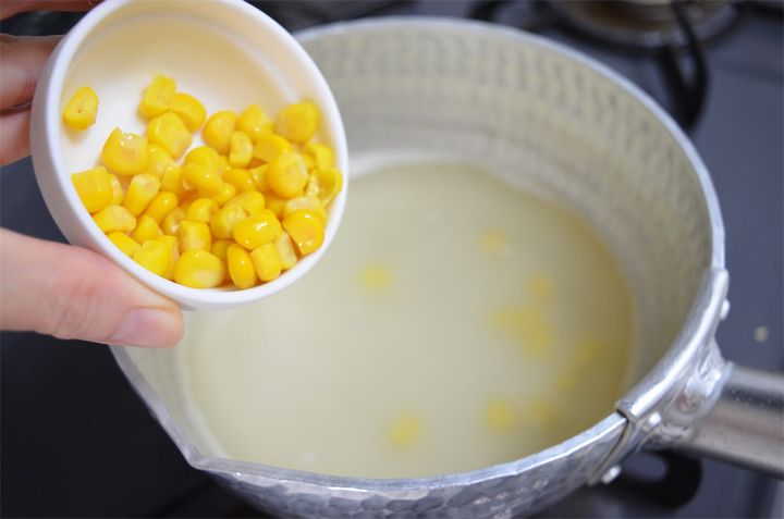 3. スープの中にコーンを入れ、塩・こしょうで味付けをする。