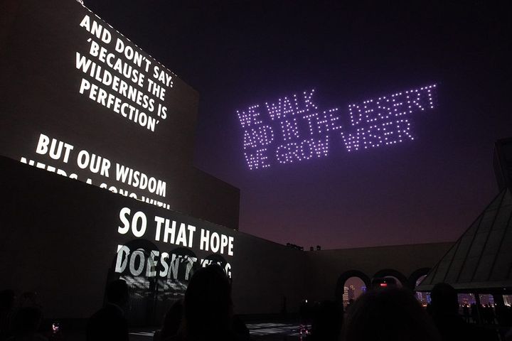 フェア開幕にあわせて公開されたのが、アメリカのコンセプチュアル・アーティスト、ジェニー・ホルツァーによる新作《SONG》である。1970年代から言葉を主な素材に制作を続けてきたホルツァーは、LEDサインや建築への投影を通じて、政治や記憶、権力といったテーマを扱ってきた。本作では、パレスチナの詩人マフムード・ダルウィーシュとUAEの詩人・映像作家ヌジューム・アルガネムの言葉を、アラビア語と英語で都市空間に解き放った。美術館の壁面への投影と700機を超えるドローンによる振付的な演出とがシンクロし、夜景そのものを舞台へと変貌させた。