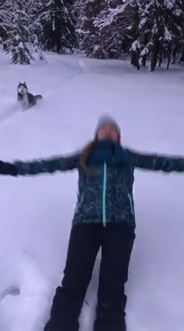 3. 降り積もった雪に女性が倒れ込むと・・!愛犬からまさかの追撃が!!【海外・動画】