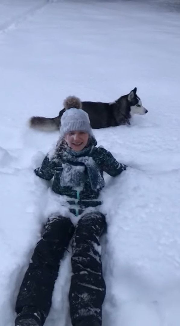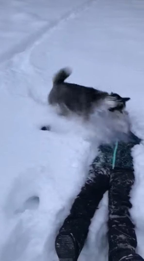 なんと、奥にいた愛犬のハスキー犬が女性の顔に目がけて雪をかけてきました!!