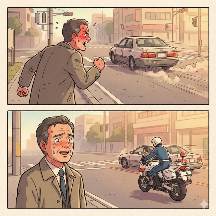 スピーカーから響き渡る、警察官の力強く威厳のある声。白バイはあっという間に私の横を通り抜け、先ほどの危険な車を猛追。