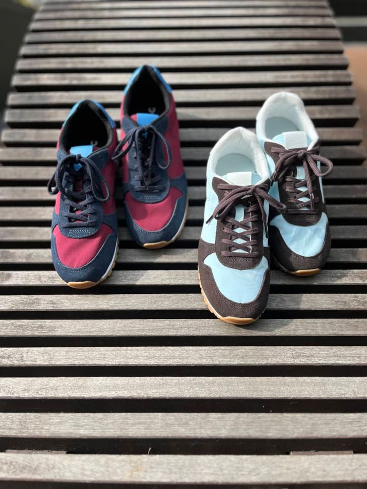 「コンビネーションスニーカー」はレトロクラシックなルックスなので、想像以上に取り入れやすかったです。まず、ワイン×ネイビーはネイビーコーデに合わせてみたのですが、統一感あるカラーリングのおかげでカジュアルすぎず、大人っぽいスニーカースタイルに仕上がりました。一方、ライトグリーン×ブラウンは淡いピンクのパンツとスタイリング。ちょっと相性が悪いかな? とも思ったのですが、ブラウンが絶妙な引き締め役になってくれました。なので、ライトトーン同士の合わせもバランスがよく、春全開の着こなしに。