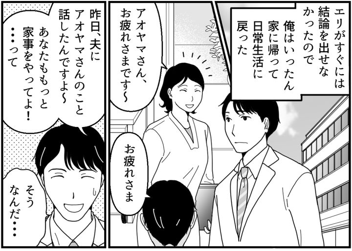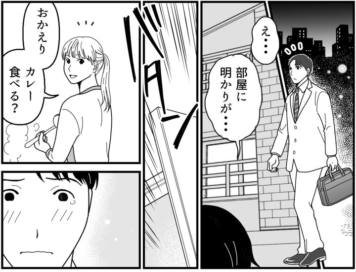 数日後のこと。俺が会社から帰って玄関ドアを開けると、部屋に明かりがついていて料理のいい香りがした。そこにエリがいた。あまりに突然のことに驚いていると、カナタが俺に向かって元気に駆け寄ってきた。エリの結論は……?