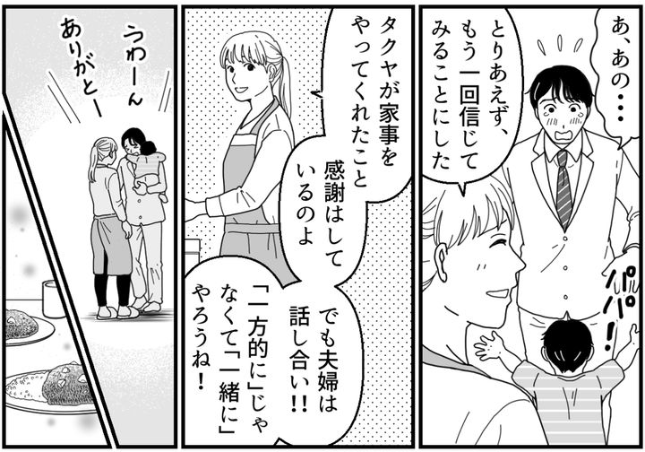 俺(タクヤ)には、妻のエリと2才の息子・カナタがいる。俺はこれまでずっと育児から逃げ、家事だけをしていた。家事が得意な夫でエリも助かっているだろうと思い込んでいた。しかし一緒に育児がしたかったエリは、カナタを連れて実家に帰ってしまった。エリは聞く耳を持たない俺に対して絶望し、離婚しようと考えていたのだ。俺は義実家に向かい、エリに心の底から謝罪した。そして一緒に育児をするから「これからの俺」を見てもらいたいと訴え……?