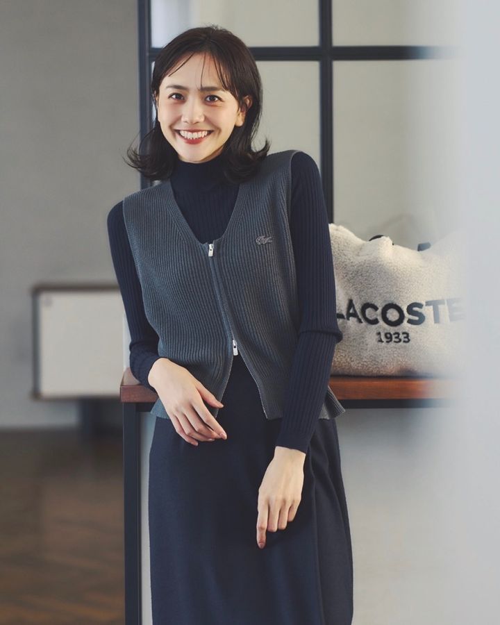 ニットベスト¥20,900タートルニット¥22,000バッグ[原宿店、EC限定]¥26,400(すべてラコステ/ラコステお客様センター)スカート¥23,100(デミルクス ビームス/デミルクス ビームス 新宿)