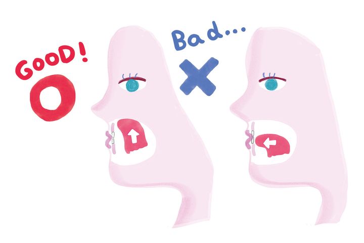 口を閉じて上唇と歯茎の間に舌を入れ、左の奥歯から前を通り右の奥歯までゆっくりとワイパーのように歯をなぞります。往復10回行うのが理想。最後にごっくんと唾を飲むと舌が正しい位置に。余裕があれば後ろで手を組み、姿勢を正して胸を開いて行ってみて。深い呼吸ができる状態で行うと猫背も改善していきます。マスクをつけると通勤電車でも取り組みやすく◎。