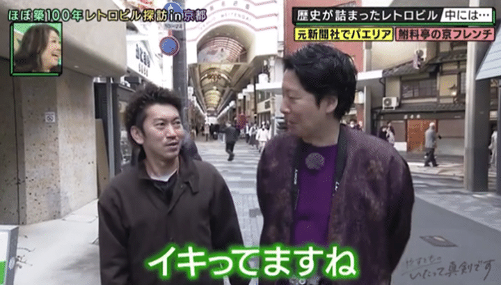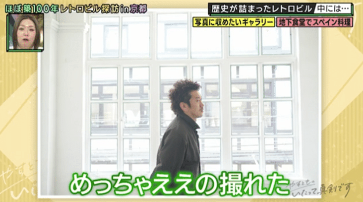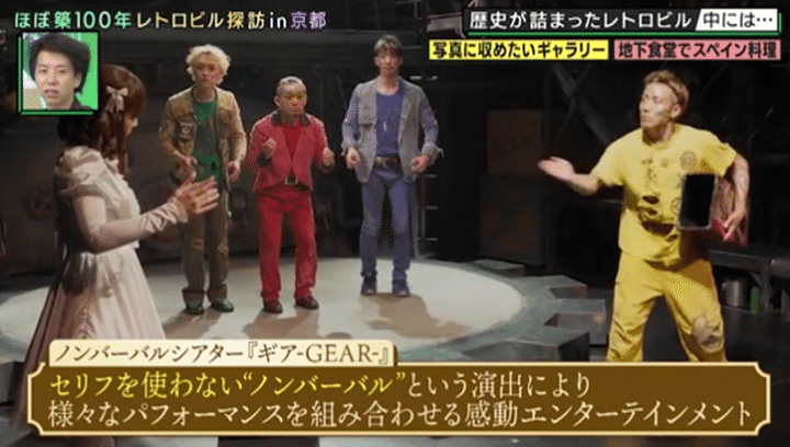 まずは、三条通り沿いにある築98年のレトロビルへ。実はこの界隈、京都出身の周平魂にとっては「マジの庭!」。若かりし頃によく遊びに来た場所らしく、今回訪ねるビルも「めちゃめちゃ来たことありますよ!」と大興奮だ。そんな京都人にはおなじみのこちらは、昭和の初めに大手新聞社の京都支局として誕生したビル。特徴的な星型の窓は、その新聞社の社章をかたどったものという。かつては編集局の仕事場だったという2階はモダンなアートギャラリーに。そして講堂だった3階には、「ここ知ってる!めちゃくちゃおもろいねん」とトキを色めき立たせた、13年でなんと35万人の観客を動員したという大人気シアターが…!