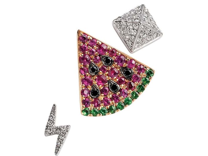 ダイヤスタッズ〈K18WG×Dia〉¥83,600 (片耳価格)スイカ〈K18RG×ルビー×ブラックDia×グリーンガーネット〉¥181, 500 (片耳価格)イナズマ〈K18WG×Dia〉¥44,000 (片耳価格)(すべてビジュードエム/ビジュードエム六本木ヒルズ)