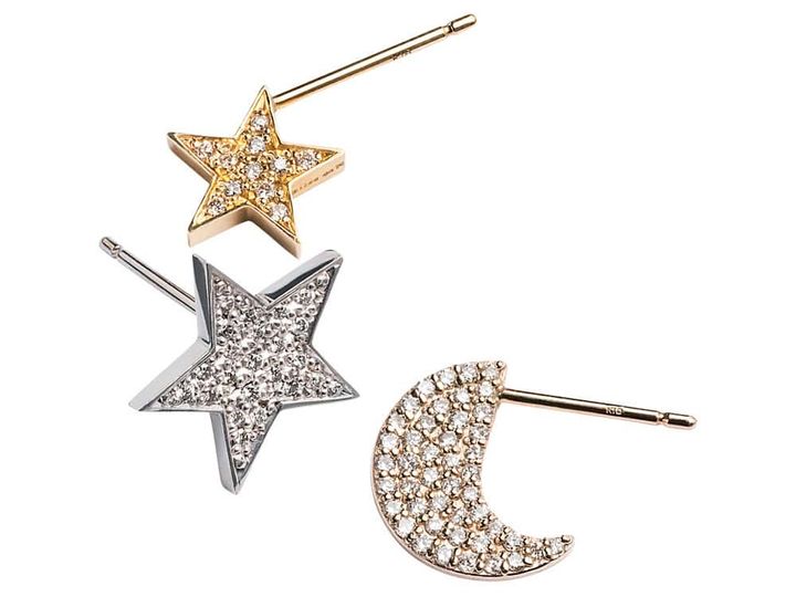 星型リバーシブル〈K18YG×Dia×樹脂〉¥93,500 (片耳価格) 星ピアス〈K18WG×Dia〉¥176,000(片耳価格)(ともにビジュードエム/ビジュードエム六本木ヒルズ) ムーンピアス〈K18YG×ラボグロウンDia〉¥136,400(片耳価格)(プライマル)レザージャケット¥176,000(アストラット/アストラット 新宿店)オールインワン¥31,900(プルミエアロンディスモン)