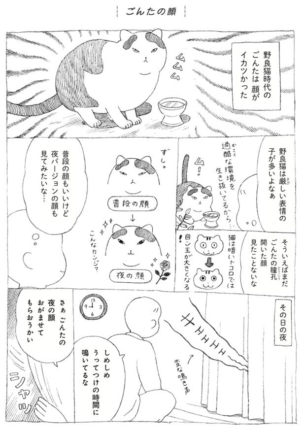 ふてぶてしい顔にどっしりとした身体、「キェ」と変な声で鳴く、元野良猫のごんた。野生時代の名残を感じさせながらも、少しずつ家猫として打ち解けていく様子に愛しさが止まりません。