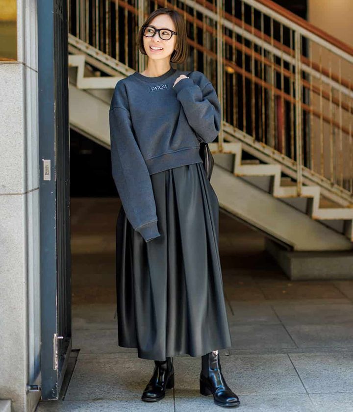 スカートがふんわりしているので短か丈のスウェットトップスでバランスを取ります。黒縁メガネやエナメルのショートブーツで引き締め効果も抜かりなく。ふんわりスカートこそレザーの力でモードエレガンスに。ハートやスマイルをクールにポイント使い。