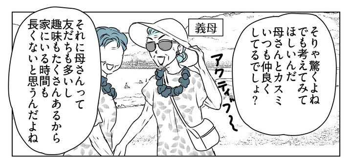 私はカスミ。夫ケンゴと2人暮らしをしています。私たちのあいだには高校生の息子タイガがいますが、今は家を出て寮暮らしをしているので、離れて暮らしています。そして私たちの近くには義母が住んでいます。去年義父が亡くなってから、義母は1人暮らし。とはいえ、もともとアクティブな人なので、趣味のサークルに出かけたり友人と旅行したりと、賑やかに過ごしているようです。さてそんなある日のこと、夫が真面目な顔で私にあることを提案してきました。