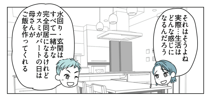 水回りや玄関は共有で、いわゆる完全同居になりますが、食事は分担制で、お互い文句を言わないというルールになりそうです。