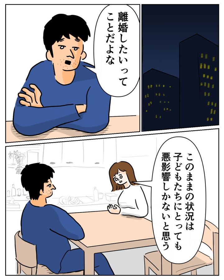 その日の夜。「離婚したいってことだよな」先に話を切り出してきたのは達夫さんでした。「このままの状況は子どもたちにとっても悪影響でしかないと思う」私の言葉に達夫さんも納得します。昨日、感情的になっていた達夫さんも、娘を想う気持ちは同じ。私と愛花はなるべく早くここから離れることで話し合いは終わりました。