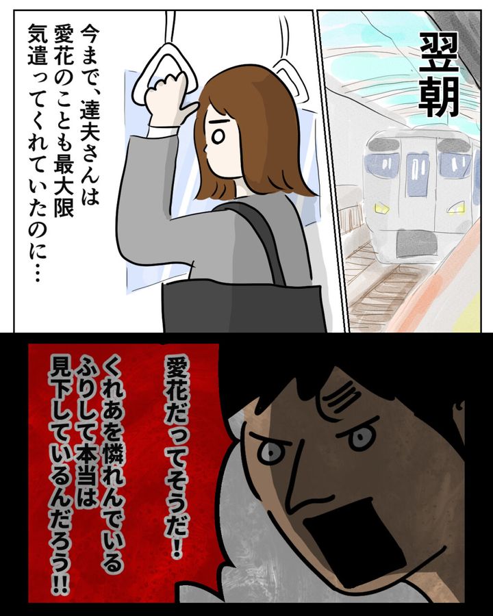 翌朝、出勤途中に昨日のことを思い出します。今までの達夫さんは愛花のことを最大限、気にかけてくれていました。でも、もうそんな面影はありません。愛花の想いを否定する達夫さんのそばに、大切な娘を置いておくことはできません。