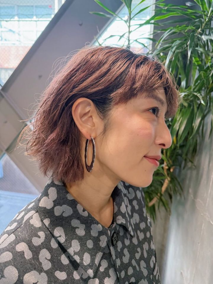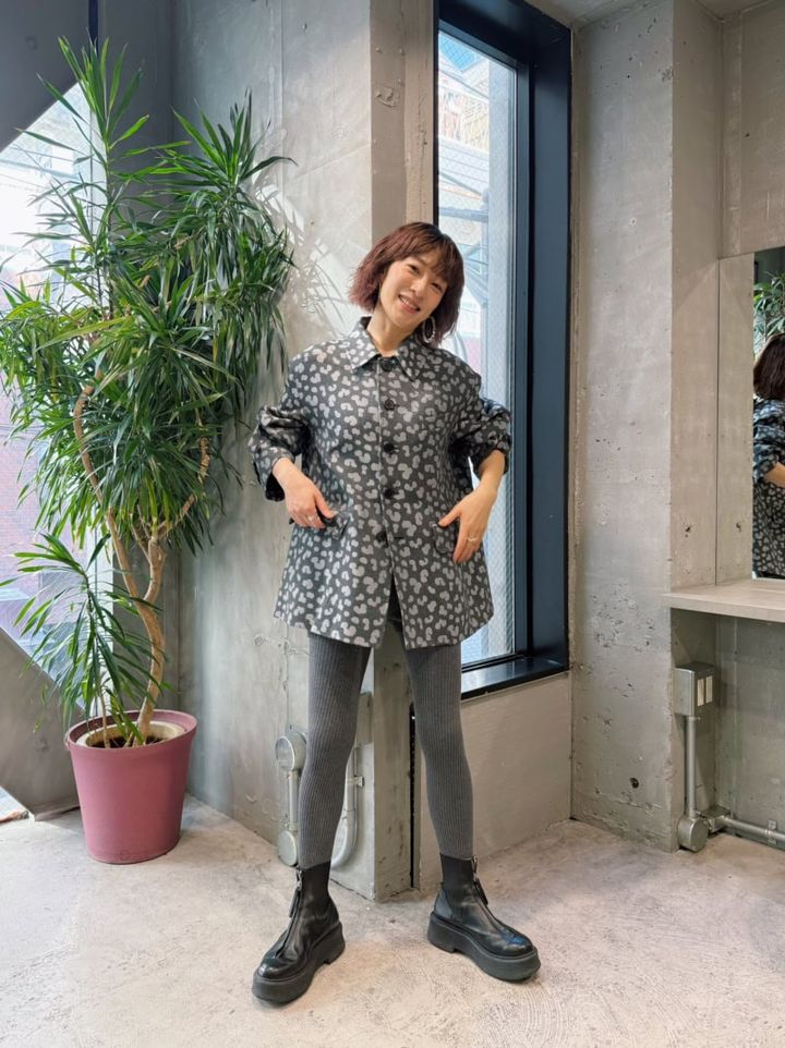「総柄ジャケットを主役にした、冬のショーパンコーデです。派手に見えないように、全身の色味は落ち着かせたのがテクニック。厚手のリブタイツやボリュームソールのショートブーツを選んで、バランスよく着こなしました!」(ヘアサロンPARKオーナー・水戸怜子さん)