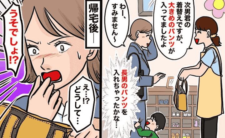 保育園にお迎えに行くと「ちょっと大きめサイズのパンツが入っていましたよ」と次男の担任の先生。「長男と次男のパンツを間違えて入れたのかな……」と思ったのですが、家に帰ってから次男のバッグを見て衝撃!