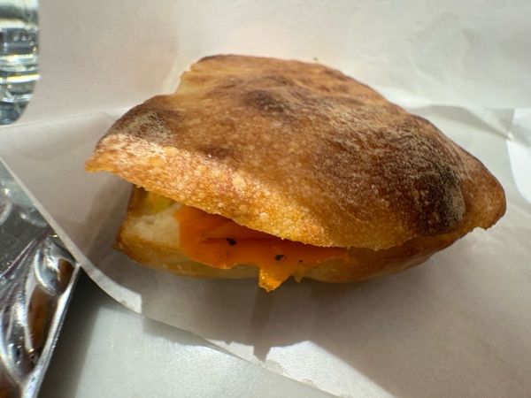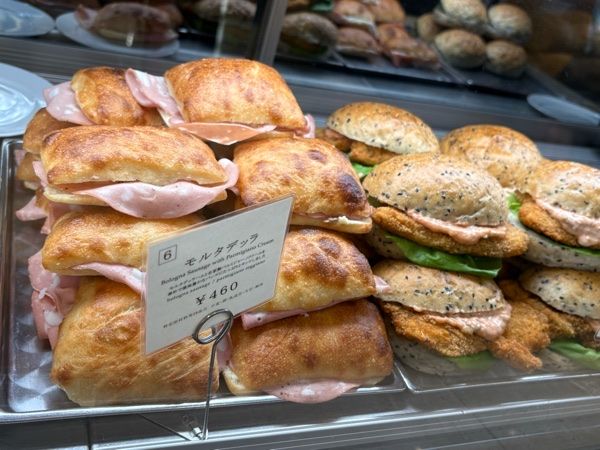 ほんの一部だけどずらりと並んでいるサンド。大きめのバンズに挟まれてる。人気のケーキ(バッラとチョコラータ)。2種類追加だよ!