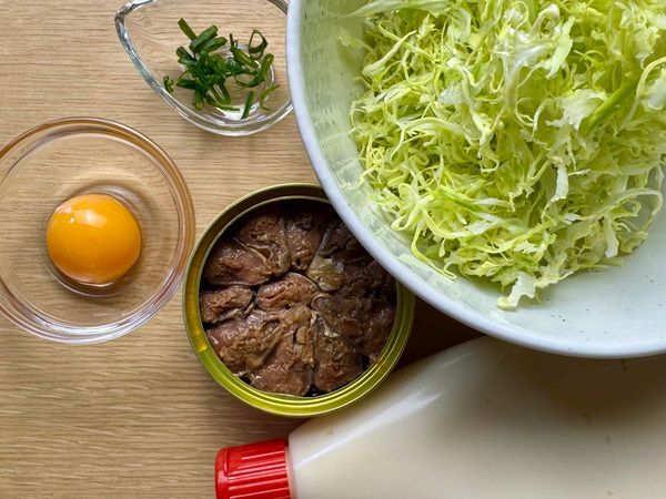 千切りキャベツと卵を乗せるだけで、大満足の一品に。