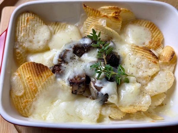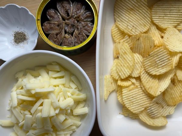1.グラタン皿に厚切りポテトチップスと北海道いわし醤油味 黒胡椒 1缶と缶の汁大さじ2を入れる。