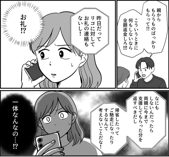 そして、そうやって家族の大事なときに駆け付けないのなら、今まで支援してもらったお金を返せとのこと。