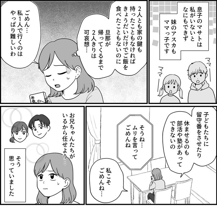 マサトは、私がいないとなにもできない子ですし、アスカだってママっ子です。2人とも、家の鍵すら持ったこともありません。そんな状況の子どもたちに、突然長時間の留守番をさせるのは、可哀想だと思いました。それに兄夫婦はいるのだから大丈夫だろうと。申し訳ないけれど、母には「手術中の付き添いはできない」と断ったのです。