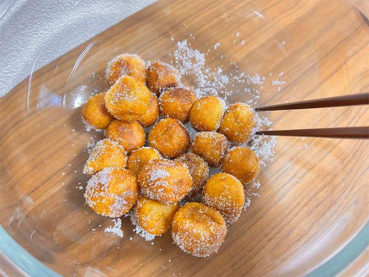 5. 油を切って、ドーナツが熱いうちに砂糖をまぶして完成。
