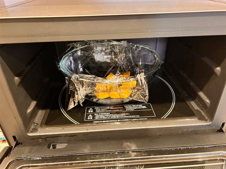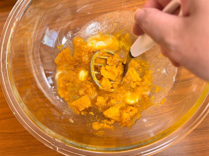1. 耐熱ボウルにかぼちゃを入れ、ふんわりラップをして500Wで3分半電子レンジで加熱する。かぼちゃが熱いうちに[A]を加えて、マッシャーなどで潰す。