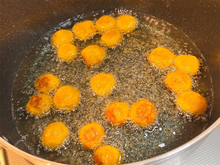 4. 生地を500円玉大に丸めたら、160~170℃に温めた油で、全体がきつね色になるまで揚げる。