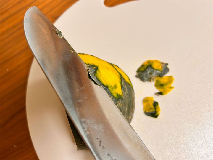 かぼちゃは種とわたを取る。包丁で皮を削ぎ、120gに量ったら、3~4cmのひと口大に切る。