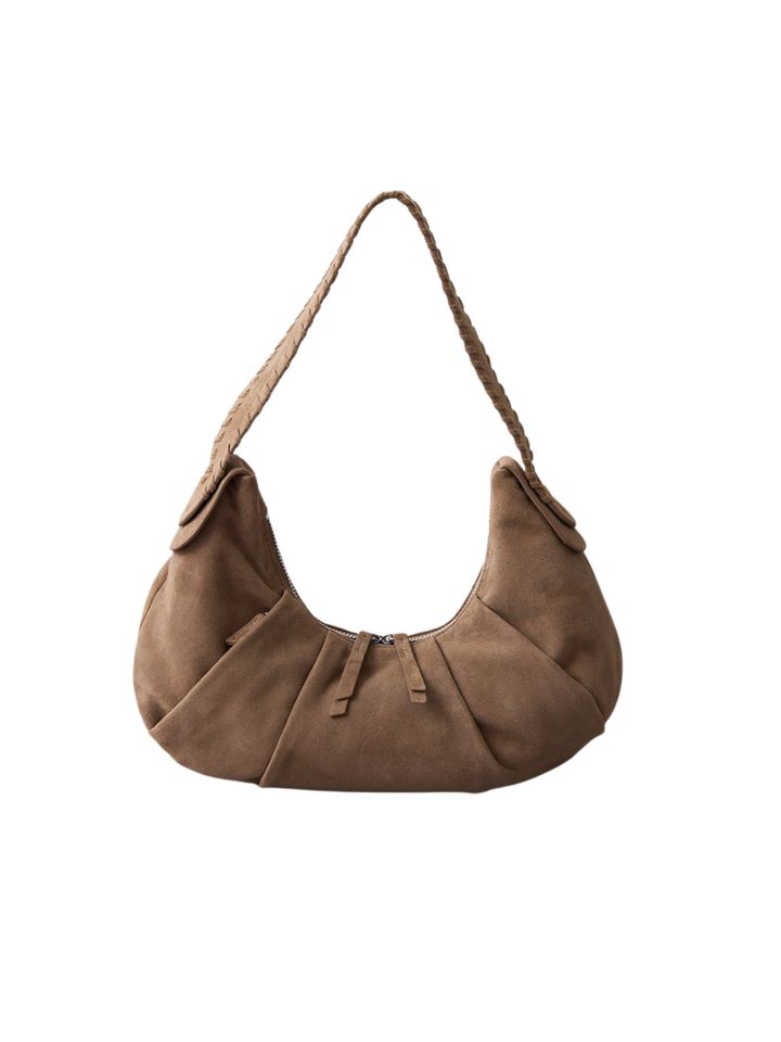 クロワッサンのように丸みを帯びたフォルムが特徴的なハーフムーンバッグ。持ち手部分にハンドステッチを施し、クラフト感のあるデザインに仕上げた逸品。
