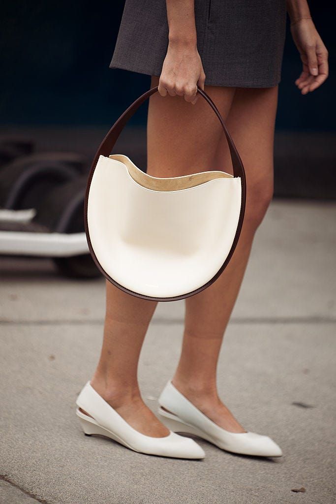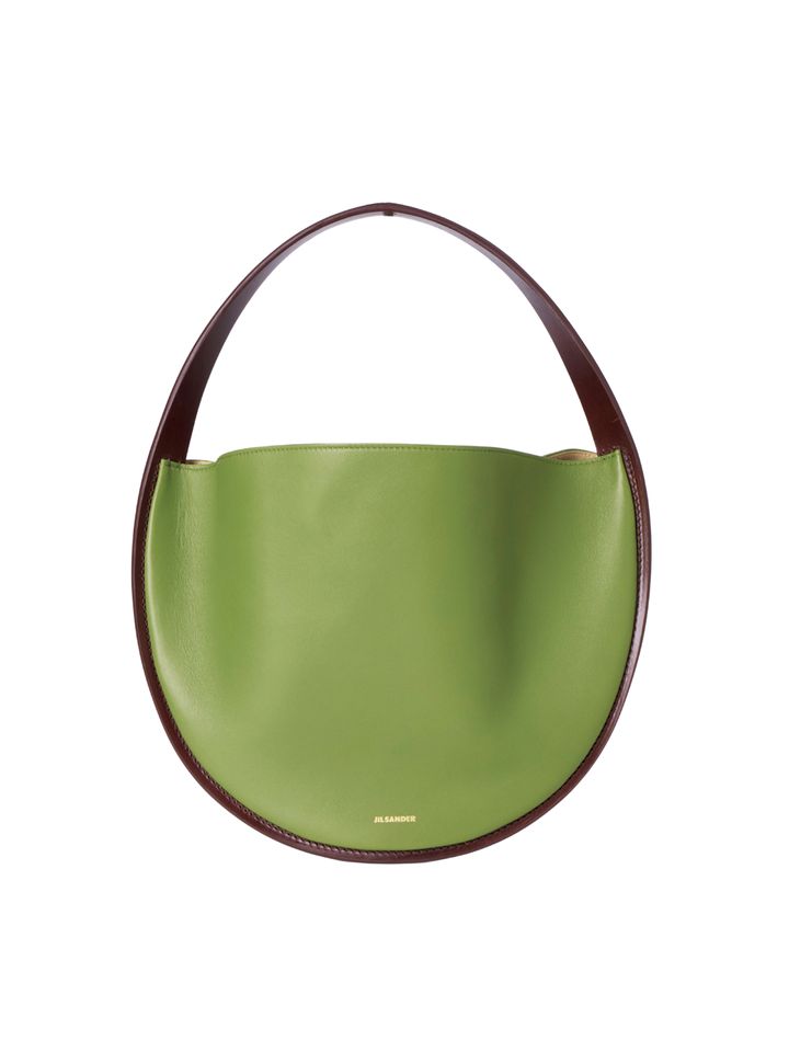 シモーネ・ベロッティによる「ジル サンダー」の新作バッグも人気急上昇中。有機的な楕円形と柔らかいラムレザーとサイドのレザーとのコントラストが美しい。