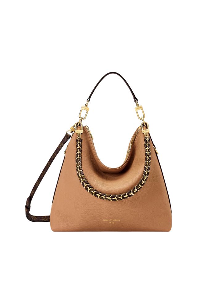 レザーのドレープが美しい、落ち感のあるU字形。ハンドルやストラップに「モノグラム・キャンバス」を利かせて。