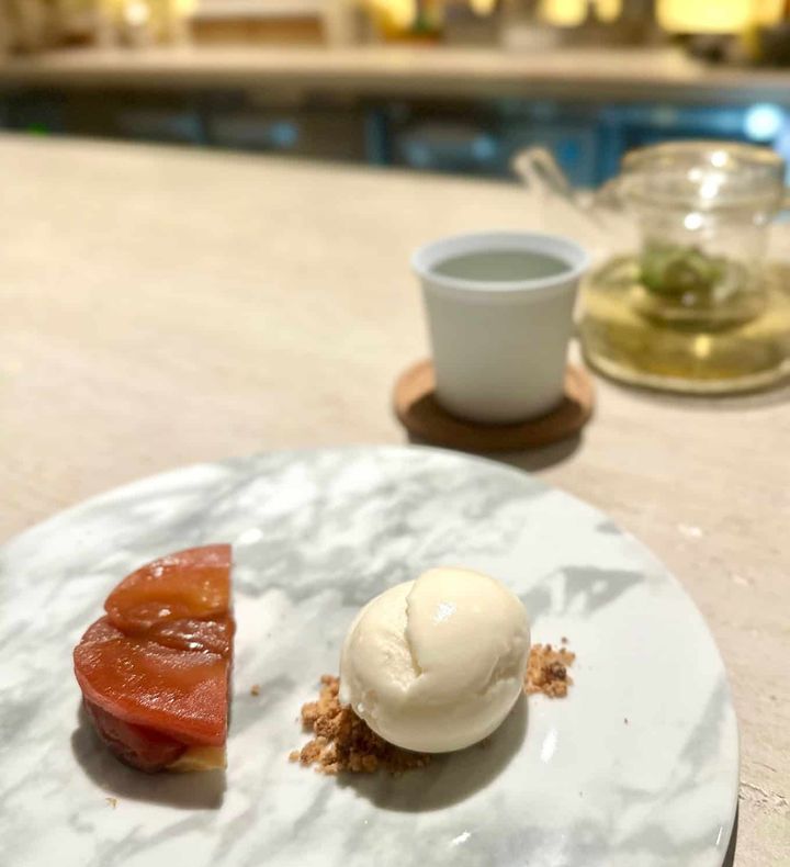 タルトタタン ミルクアイスクリーム添え。佐久市のハーブを使ったオリジナルハーブティーとともに。