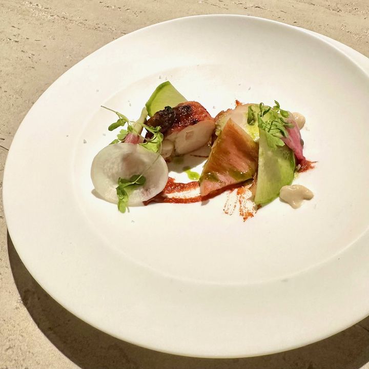 低温調理してから炭火焼で香ばしく焼いたタコと、三浦半島有機野菜のカブのアミューズ。自家製ハリッサソースとゴルゴンゾーラ風味の麹チーズを添えて。
