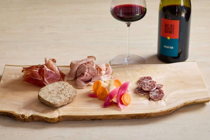 カットプレート(熟成ハム、サラミ、自家製パテ、自家製ピクルス)中¥3,190、グラスワイン¥1,500〜、ボトルワイン¥6,000〜、ペアリング 4杯¥6,000/6杯¥10,000